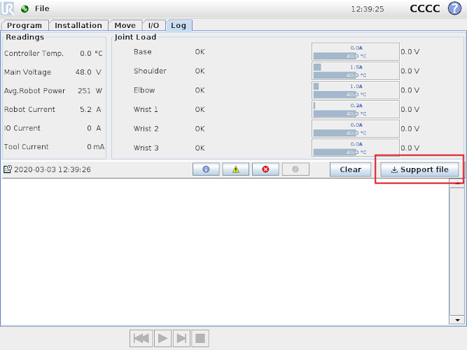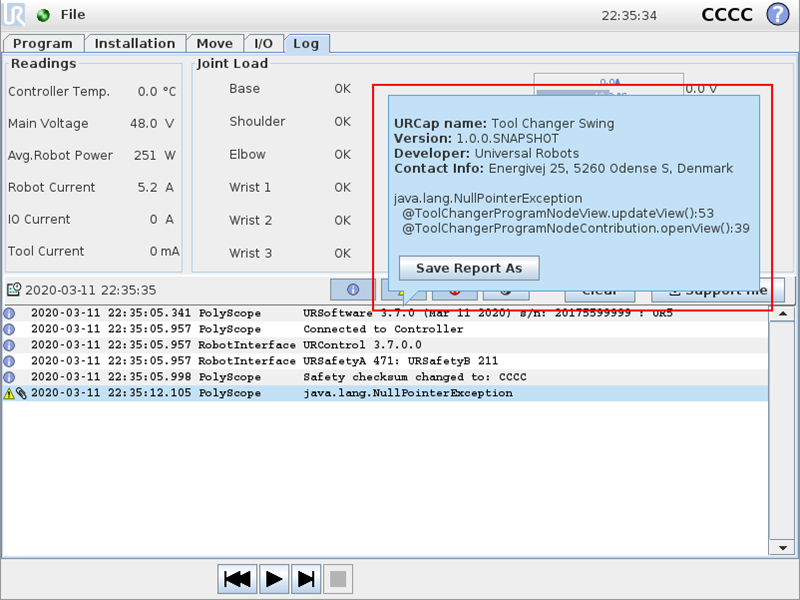 - When a Java exception has occurred in the code of a URCap, a detailed explanation including URCap information and stack trace is now provided in the Log tab (as a tooltip)