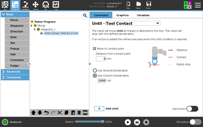 - Until Tool Contact: New Until node can stop robot movement when it detects a physical contact of the tool, using the embedded force torque sensor in the robot's tool flange. Example applications are?Stacking/Destacking, where Until Tool Contact determines the height of stacked objects.