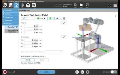 - Remote Tool Center Point: New Remote TCP URCap simplifies programming of applications that require the robot to move a picked object through positions relative to a fixed tool in the workspace, like deburring, sewing or dispensing. The Remote TCP can be configured in the Polyscope Installation Tab after the Remote TCP URCap has been activated. Activate the Remote TCP URCap by following the instructions under Settings>Systems>Robot Registration on the robot user interface.