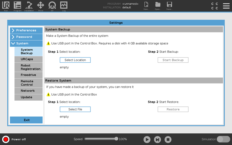 - On this tab user can initiate the backup and restore processes. A USB-stick with at least 4Gb of free space is required to store a backup. All robot data (system, programs, installations, ...) will be backed up. After a restore the robot will be brought back to exactly the same state as it was when the backup was done.