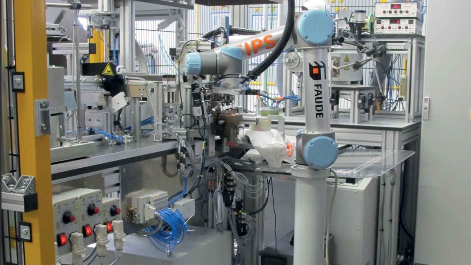 現(xiàn)在,兩臺彼此密切合作的 UR 機(jī)器人與其他機(jī)器共同控制復(fù)雜的釬焊和焊接流程。第一臺機(jī)器人選擇待焊接的部件,將該部件插入預(yù)焊機(jī)內(nèi),然后將部件置于液體中。第二臺機(jī)器人將部件帶到高頻焊接站進(jìn)行融合。然后機(jī)器人把部件舉到攝像系統(tǒng)前,以自動檢查焊接和釬焊工作的質(zhì)量。