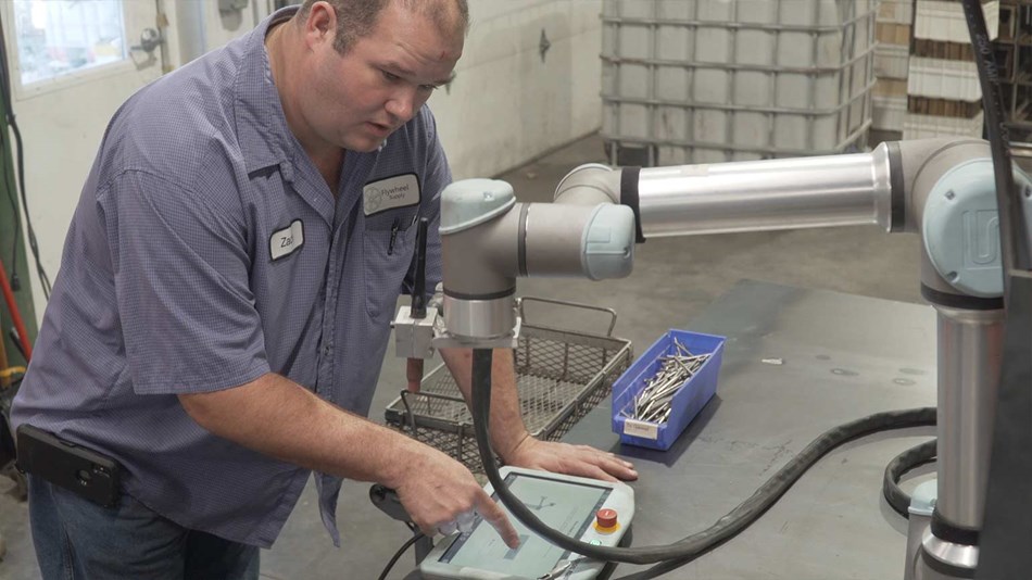鑒于Flywheel的高混合、小批量生產(chǎn)方式,該公司很難以高成本效益的方式實(shí)現(xiàn)眾多流程的自動(dòng)化,如重復(fù)性的人工機(jī)器看護(hù)和焊接任務(wù),特別是在缺乏機(jī)器人經(jīng)驗(yàn)的情況下。機(jī)器看護(hù)應(yīng)用還提出了其他挑戰(zhàn),如上游機(jī)器加工產(chǎn)生的零件含油,導(dǎo)致機(jī)器人難以準(zhǔn)確抓取和放置,但在工序之間設(shè)置清洗站會(huì)增加成本并導(dǎo)致延誤。