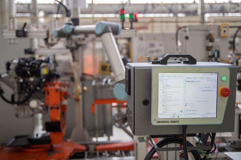 福特在羅馬尼亞克拉約瓦的工廠現(xiàn)已安裝了4臺(tái)UR10。其中3臺(tái)UR10已直接集成到工作流程中,并在裝配線上和員工一起工作,接管了那些重復(fù)性的工作。其中1臺(tái)UR10用于給凸輪軸從動(dòng)件上潤滑油,另一臺(tái)UR10給發(fā)動(dòng)機(jī)加油,還有一臺(tái)UR10使用紫外線和攝像機(jī)檢查發(fā)動(dòng)機(jī)在加油后是否漏油。在發(fā)動(dòng)機(jī)檢查過程中使用的攝像機(jī)為Cognex視覺攝像機(jī),這是一種可以通過以太網(wǎng)與協(xié)作式機(jī)器人通信的UR+產(chǎn)品。UR10協(xié)作式機(jī)器人借助福特工程師根據(jù)應(yīng)用情況專門制造和定制的末端執(zhí)行器(夾具)來運(yùn)行攝像機(jī)。第4臺(tái)UR10用于測(cè)試和培訓(xùn),且很快會(huì)執(zhí)行指定的操作任務(wù)。UR10集成到控制裝配線的系統(tǒng)上后,裝配過程大大簡化。協(xié)作式機(jī)器人不需要人工干預(yù),除非常規(guī)過程發(fā)生變化。