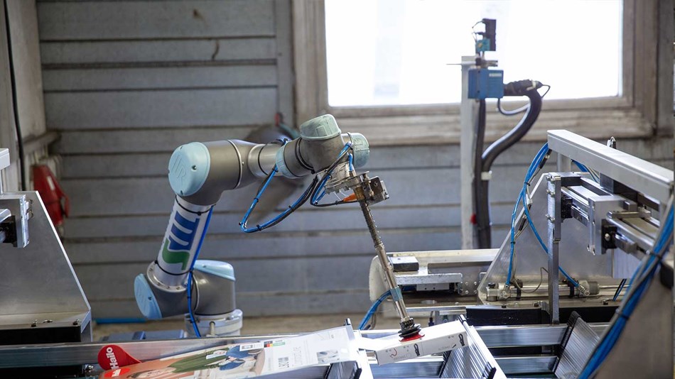 UR5直接安置于傳送帶旁邊。每當(dāng)傳送帶上的梯子靠近時,協(xié)作式機器人就會用真空夾具從操作說明盒里拿起一份手冊。然后把手冊移動到熱熔膠槍上,涂上粘合劑,最后通過輕壓將其貼在梯子的臺階上。UR5協(xié)作式機器人還用于為其他型號的梯子夾上附件紙盒。