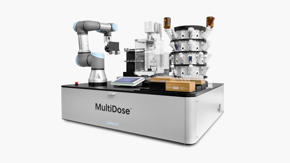 最終,Labman開(kāi)發(fā)了這款叫做MultiDose的自動(dòng)固體加樣實(shí)驗(yàn)室儀器,它圍繞優(yōu)傲UR3e協(xié)作機(jī)器人進(jìn)行設(shè)計(jì),配備了Robotiq公司的UR+認(rèn)證Hand-E夾持器,該夾持器與梅特勒托利多 XPR粉末加樣系統(tǒng)和Labman的軟件相結(jié)合,可實(shí)現(xiàn)高效、準(zhǔn)確的重復(fù)加樣。