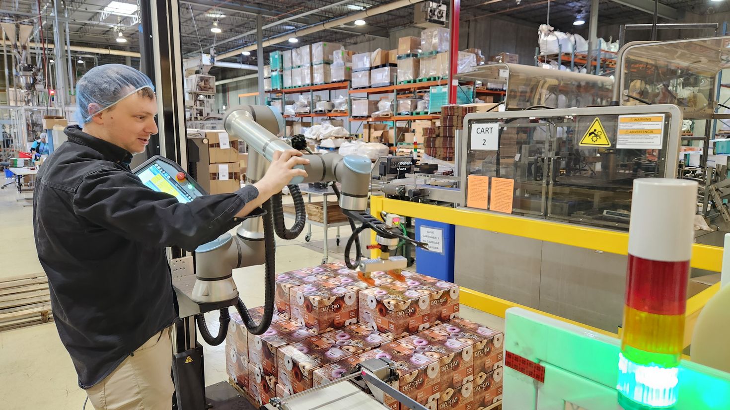 Napco Brands選擇了UR認證的系統(tǒng)集成商DesignHawk Innovations幫助其部署了兩臺協(xié)作機器人碼垛機——當箱子通過自動封箱機到達輸送機時,兩臺協(xié)作機器人會拾取箱子,并將其放置在托盤上。通過優(yōu)傲協(xié)作機器人自帶的觸屏示教器,輸入箱子尺寸、托盤尺寸和形狀,就能夠快速生成應(yīng)用程序,模擬出準確的生產(chǎn)流程。