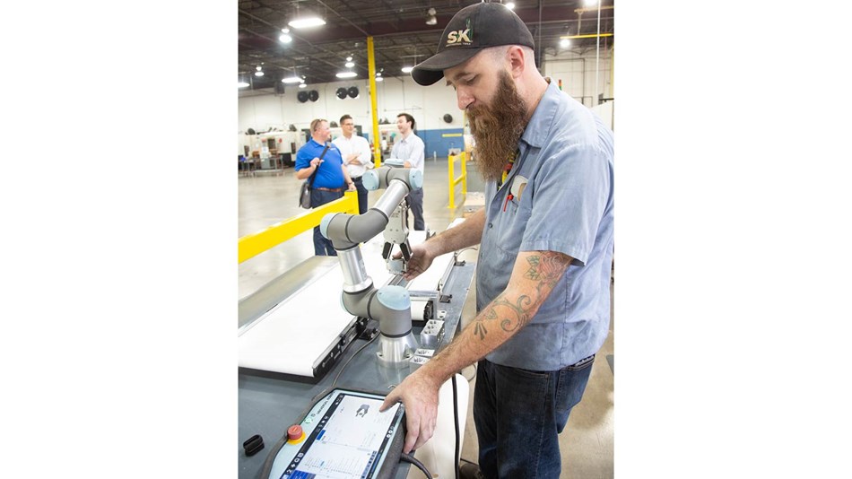 Tomenson Machine Works是制造精密液壓分路閥箱的全球性公司。在該公司的芝加哥總部,優(yōu)傲機(jī)器人公司的UR3協(xié)作機(jī)器人正在執(zhí)行銷釘沖壓工藝,處理幾十個(gè)不同尺寸的零件。協(xié)作機(jī)器人驅(qū)動(dòng)的解決方案降低了40%的上料錯(cuò)誤率,提高了公司的利潤率,并在6-7個(gè)月內(nèi)實(shí)現(xiàn)了投資回報(bào)。