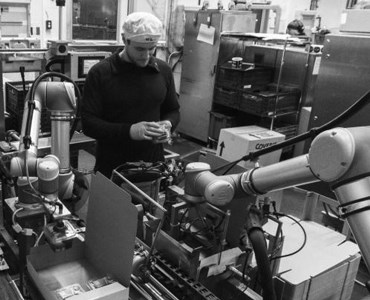 優(yōu)傲協(xié)作式機(jī)器人在食品和飲料供應(yīng)鏈中廣泛應(yīng)用于包裝和機(jī)器看護(hù)等次級流程。協(xié)作式機(jī)器人可以在潮濕的溫室、冷藏室、加熱爐等環(huán)境中工作,將員工從重復(fù)性工作中解放出來,以免不利環(huán)境對人員造成傷害。